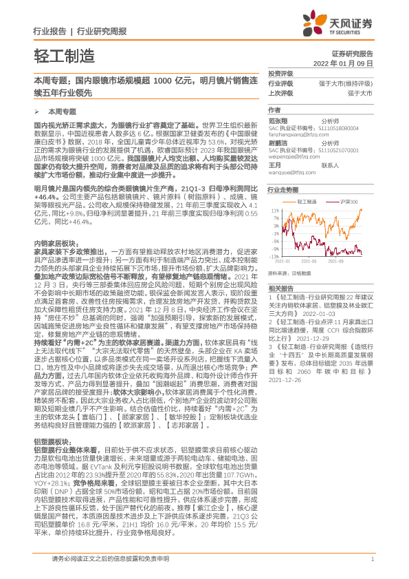【天风证券】【20220109】轻工制造本周专题:国内眼镜市场规模超1000亿元,明月镜片销售连续五年行业领先-26页
