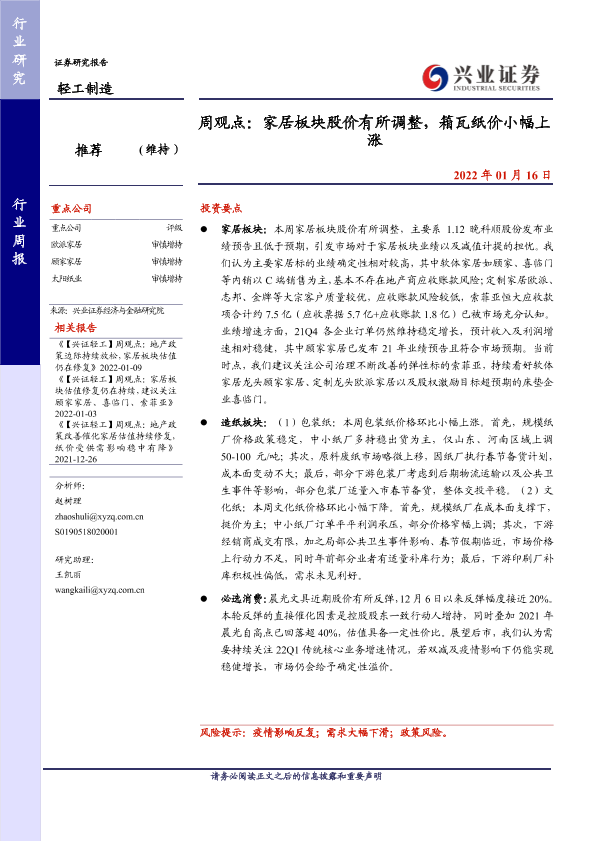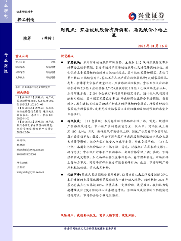 【兴业证券】【20220116】20220116-兴业证券-轻工制造周观点:家居板块股价有所调整,箱瓦纸价小幅上涨-24页