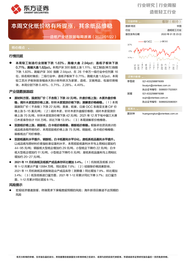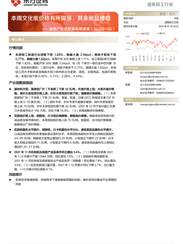 【东方证券】【20220123】20220123-东方证券-造纸产业链数据每周速递:本周文化纸价格有所提涨,其余纸品维稳-13页