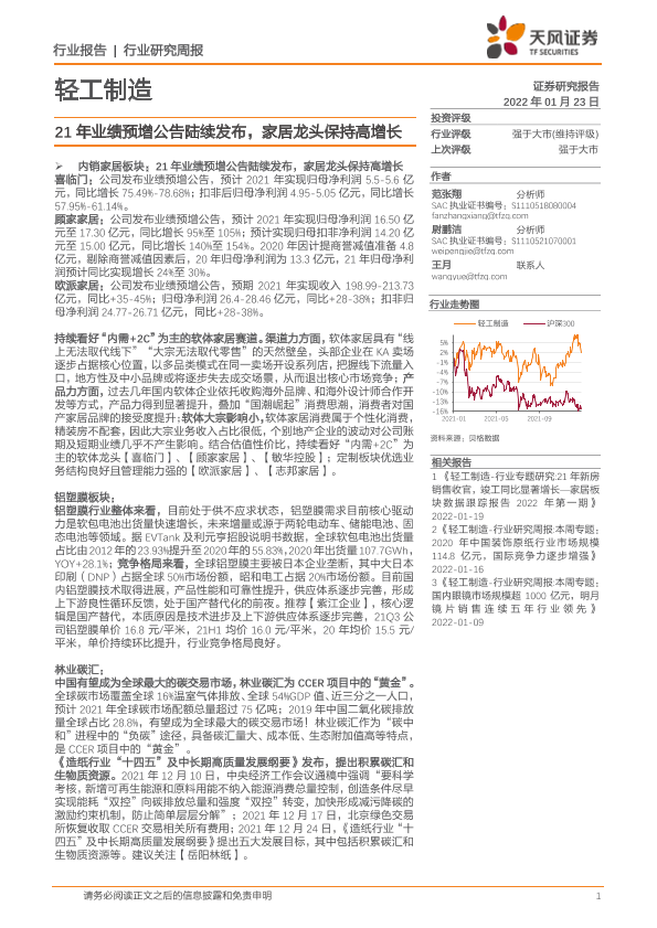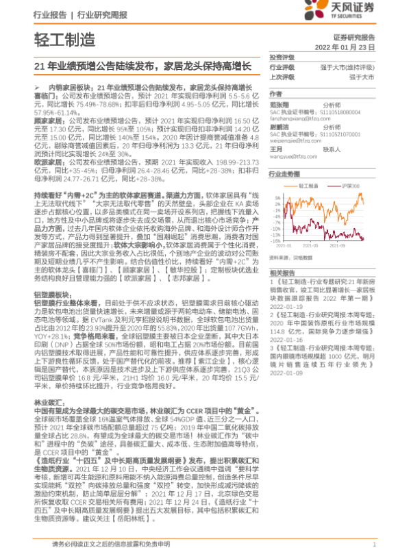 【天风证券】【20220123】20220123-天风证券-轻工制造行业研究周报:21年业绩预增公告陆续发布,家居龙头保持高增长-22页