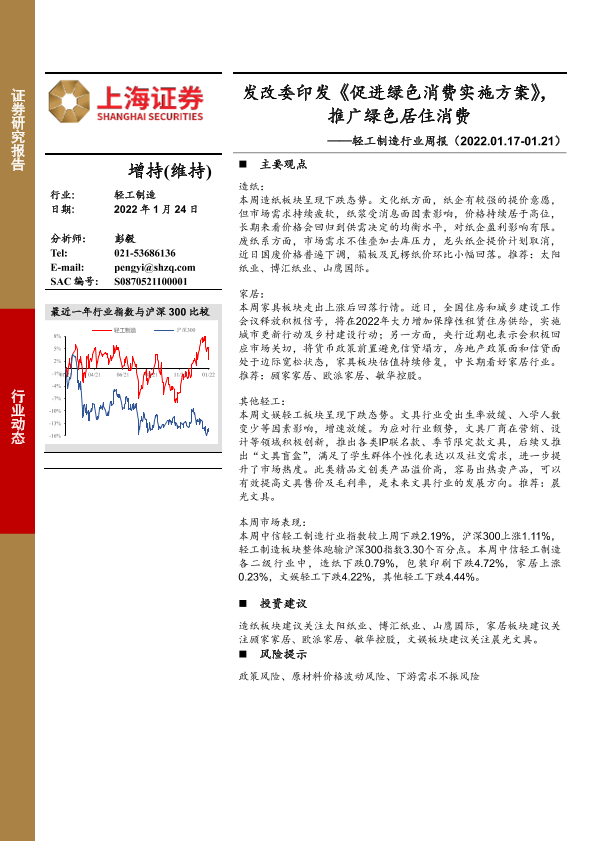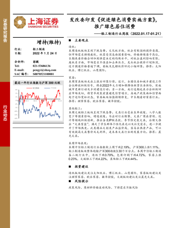 【上海证券】【20220124】轻工制造行业周报:发改委印发《促进绿色消费实施方案》,推广绿色居住消费-15页