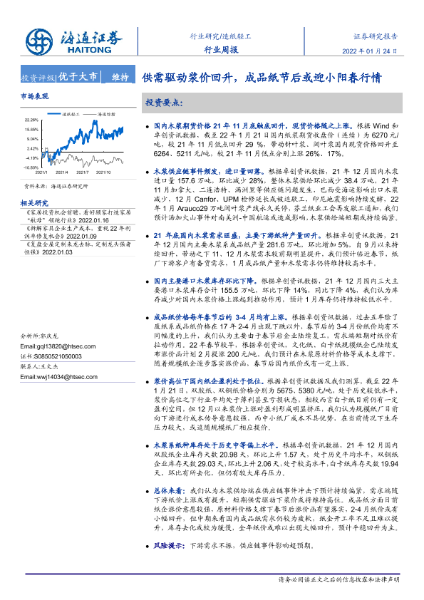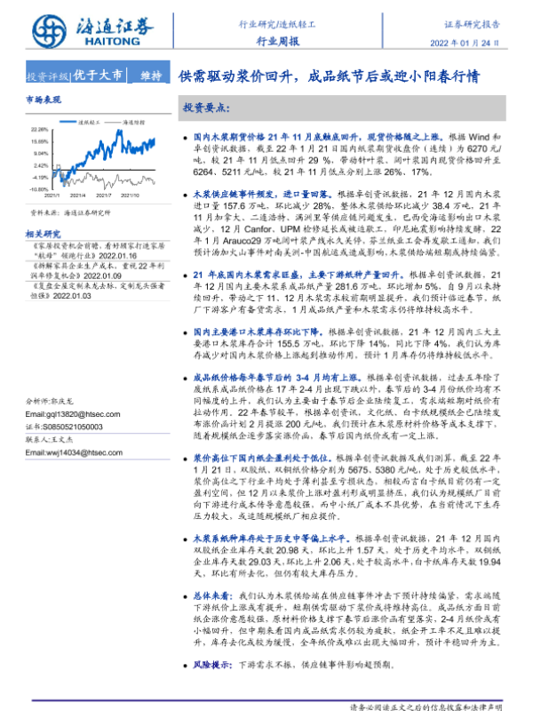 【海通证券】【20220124】20220124-海通证券-造纸轻工行业周报:供需驱动浆价回升,成品纸节后或迎小阳春行情-13页
