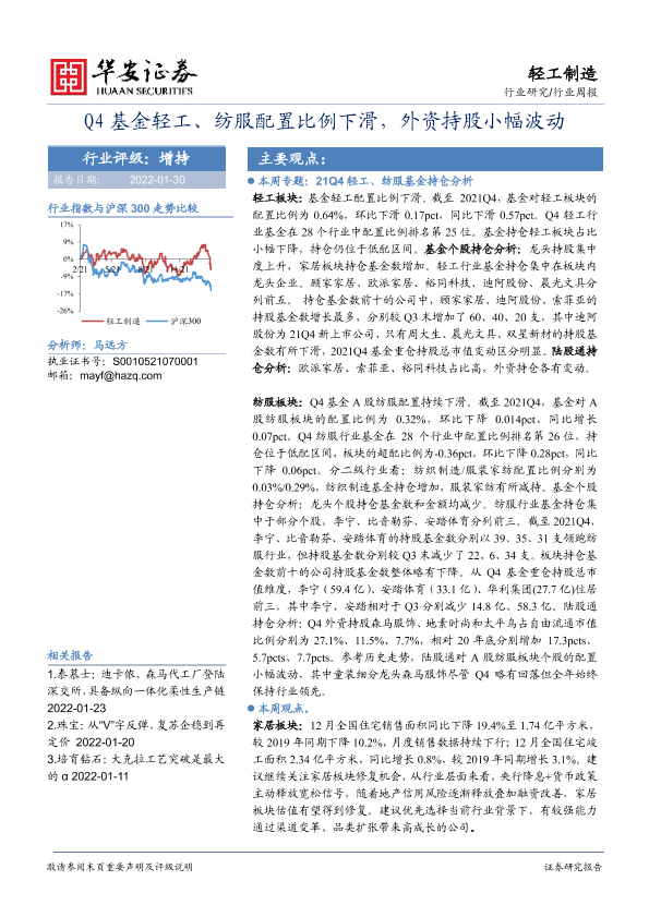 【华安证券】【20220130】20220130-华安证券-轻工制造行业周报:Q4基金轻工、纺服配置比例下滑,外资持股小幅波动-15页