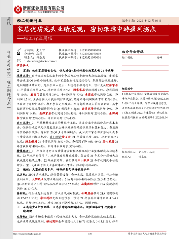 【浙商证券】【20220206】20220206-浙商证券-轻工行业周报:家居优质龙头业绩兑现,密切跟踪中游盈利拐点-27页