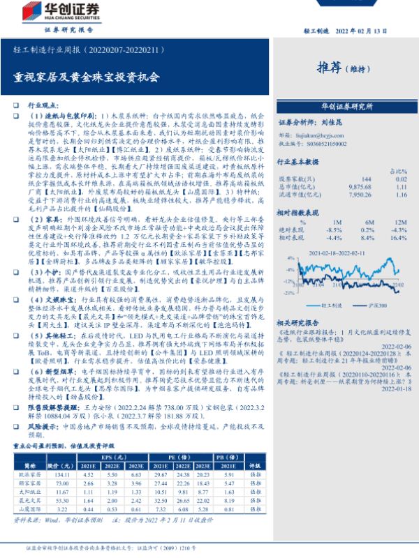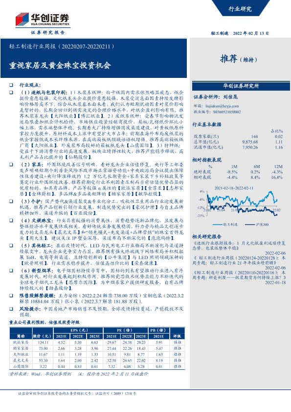 【华创证券】【20220213】20220213-华创证券-轻工制造行业周报:重视家居及黄金珠宝投资机会-16页