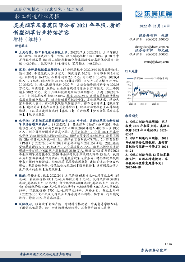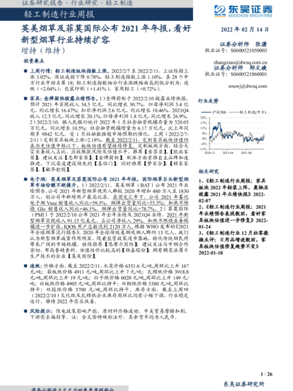 【东吴证券】【20220214】20220214-东吴证券-轻工制造行业周报:英美烟草及菲莫国际公布2021年年报,看好新型烟草行业持续扩容-26页