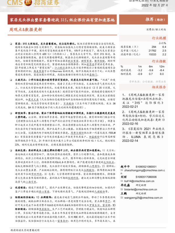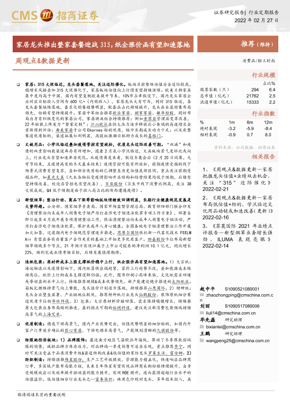 【海通证券】【20220227】轻工时尚周观点&数据更新:家居龙头推出整家套餐迎战315,纸企涨价函有望加速落地-23页