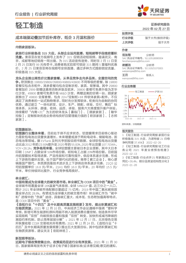 【天风证券】【20220227】轻工制造行业研究周报:成本端驱动叠加节后补库存,纸企3月温和涨价-22页