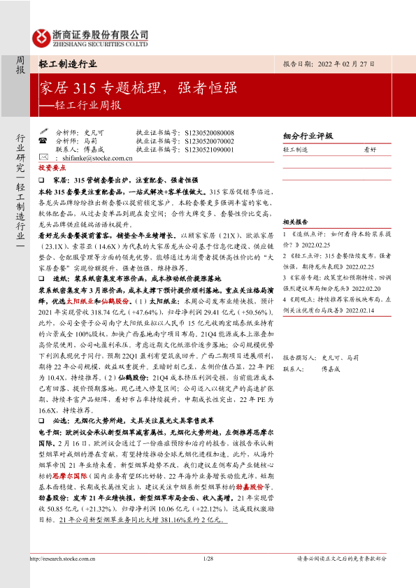 【浙商证券】【20220227】20220227-浙商证券-轻工行业周报:家居315专题梳理,强者恒强-28页