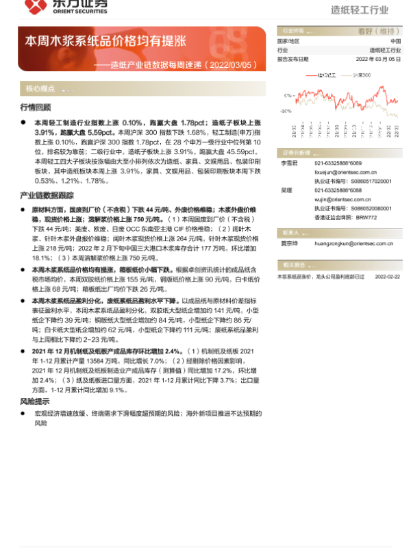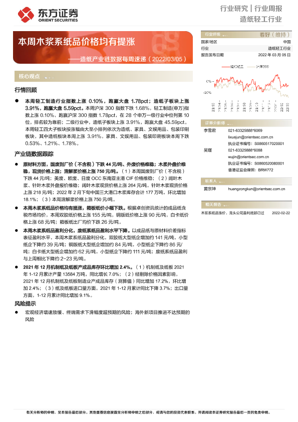 【东方证券】【20220305】20220305-东方证券-造纸轻工行业:造纸产业链数据每周速递:本周木浆系纸品价格均有提涨-13页
