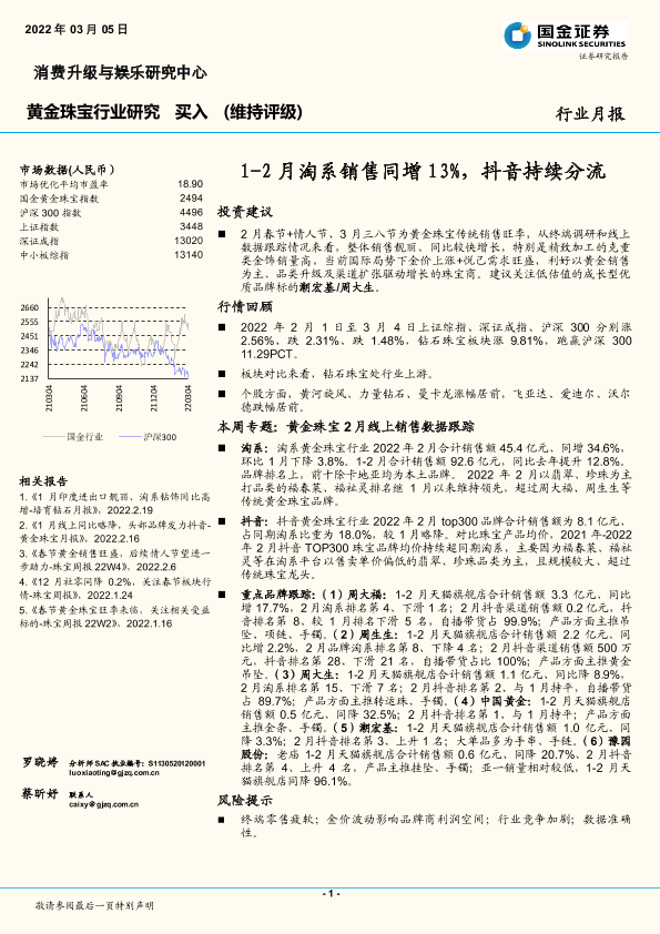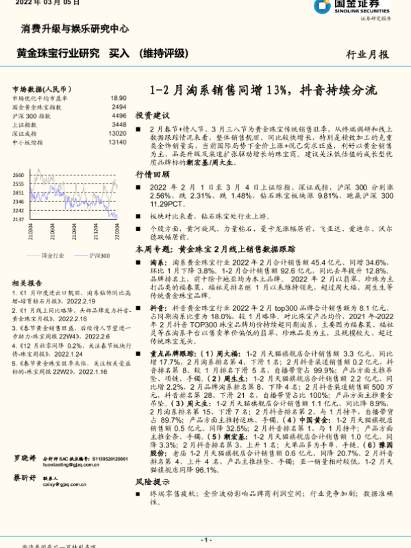 【国金证券】【20220305】20220305-国金证券-黄金珠宝行业研究:1-2月淘系销售同增13%,抖音持续分流-12页