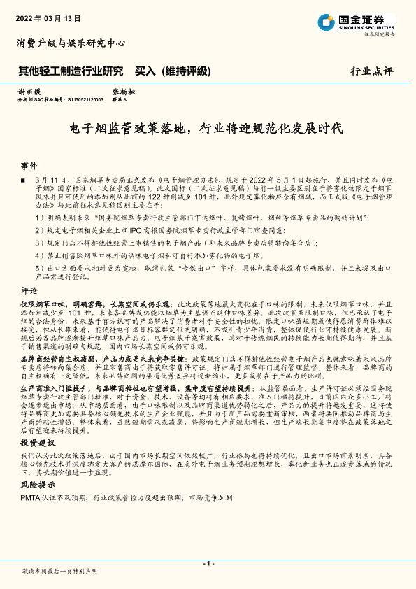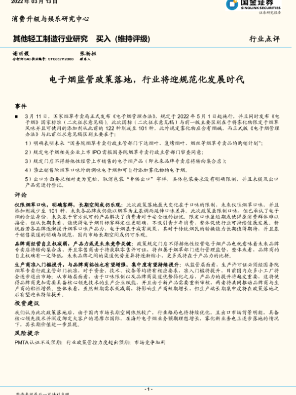 【国金证券】【20220313】其他轻工制造行业研究:电子烟监管政策落地,行业将迎规范化发展时代-3页