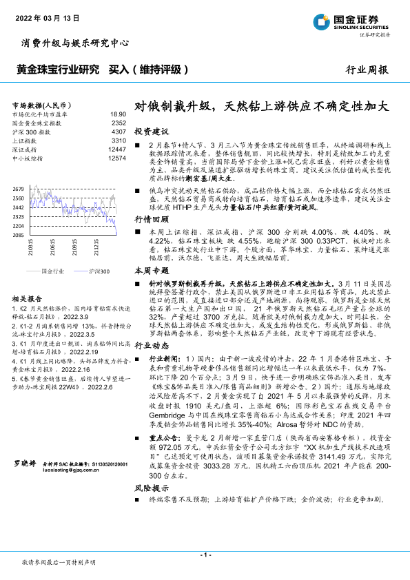 【国金证券】【20220313】20220313-国金证券-黄金珠宝行业研究:对俄制裁升级,天然钻上游供应不确定性加大-8页