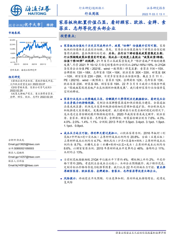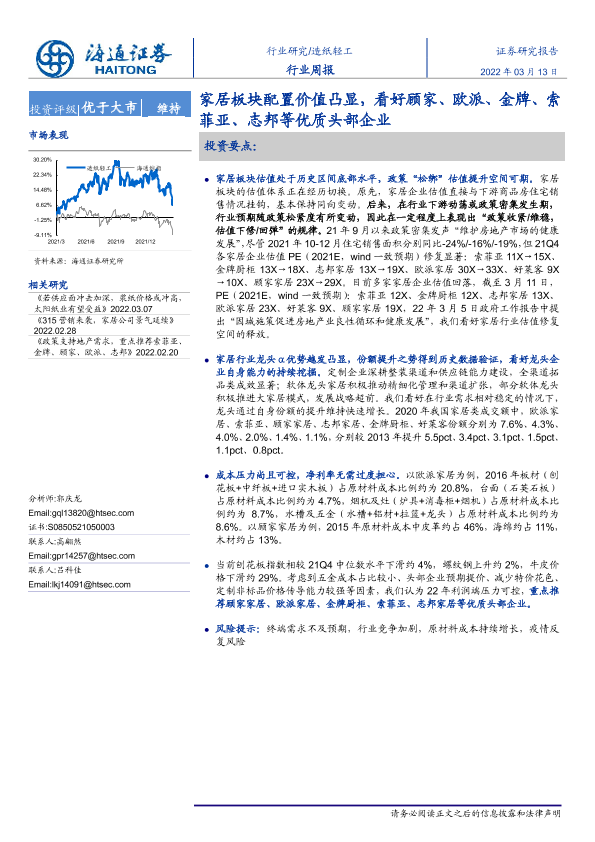 【海通证券】【20220313】20220313-海通证券-造纸轻工行业周报:家居板块配置价值凸显,看好顾家、欧派、金牌、索菲亚、志邦等优质头部企业-12页
