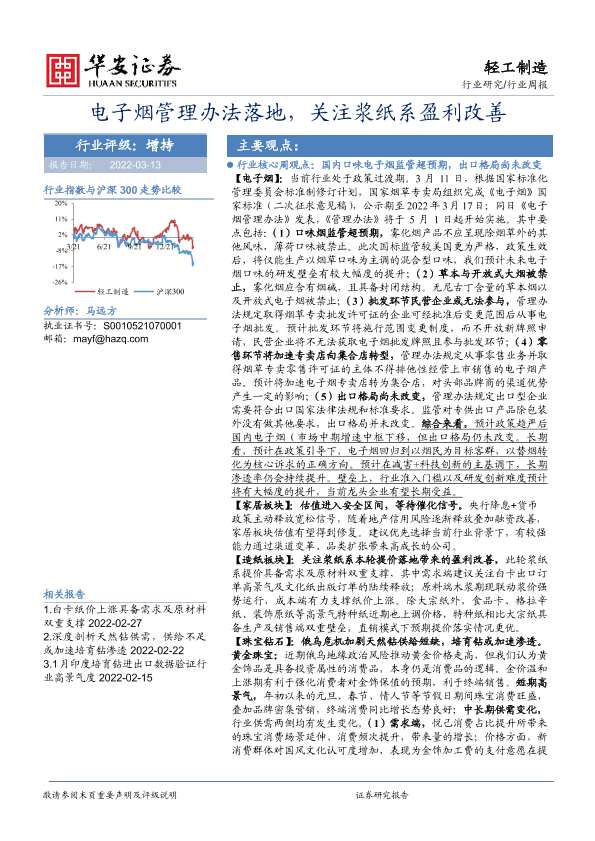 【华安证券】【20220313】20220313-华安证券-轻工制造行业周报:电子烟管理办法落地,关注浆纸系盈利改善-18页