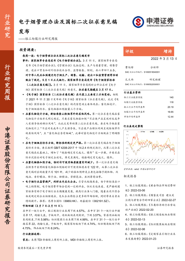 【申港证券】【20220313】20220313-申港证券-轻工纺服行业研究周报:电子烟管理办法及国标二次征求意见稿发布-18页