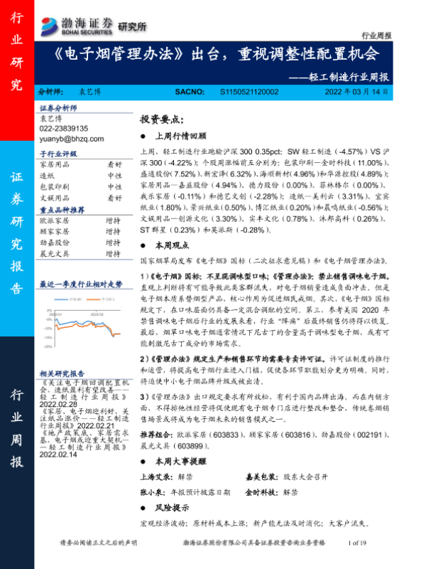 【渤海证券】【20220314】20220314-渤海证券-轻工制造行业周报:《电子烟管理办法》出台,重视调整性配置机会-19页