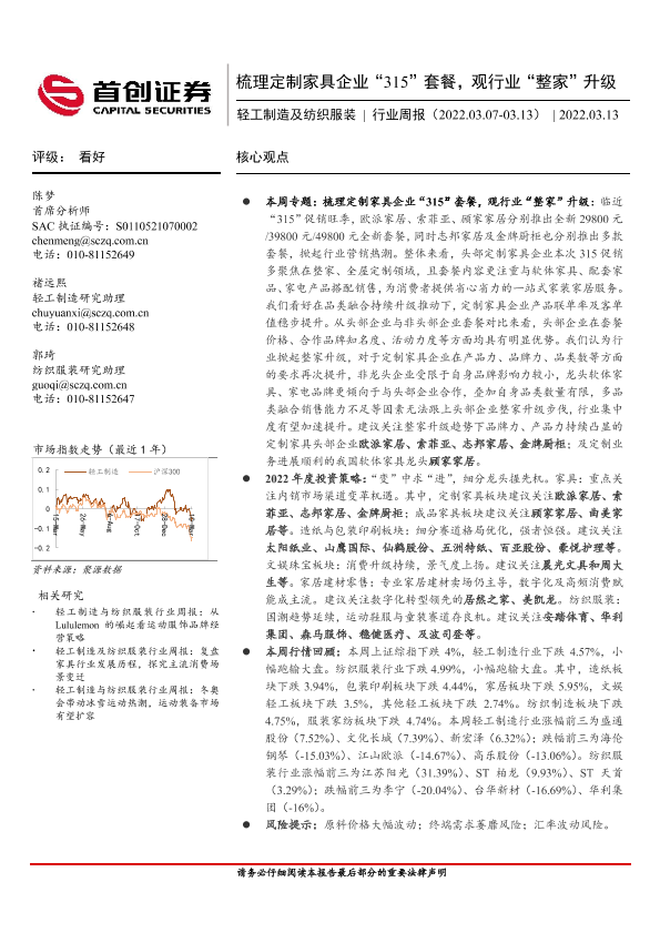 【首创证券】【20220313】20220313-首创证券-轻工制造及纺织服装行业周报:梳理定制家具企业“315”套餐,观行业“整家”升级-17页