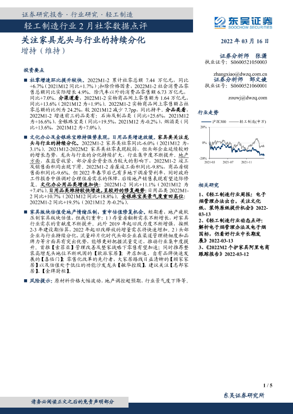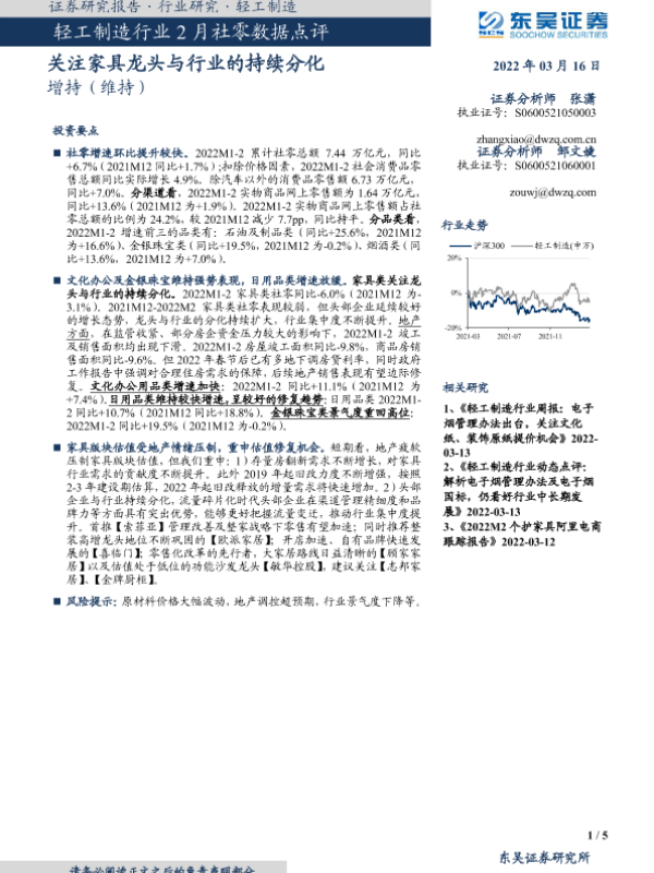 【东吴证券】【20220316】轻工制造行业2月社零数据点评:关注家具龙头与行业的持续分化-5页