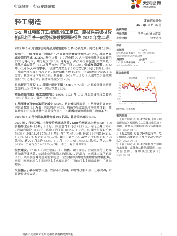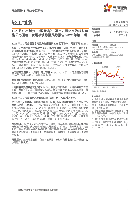 【天风证券】【20220316】家居板块数据跟踪报告2022年第二期:1-2月住宅新开工 销售 竣工承压,原材料端板材价格环比回落-14页