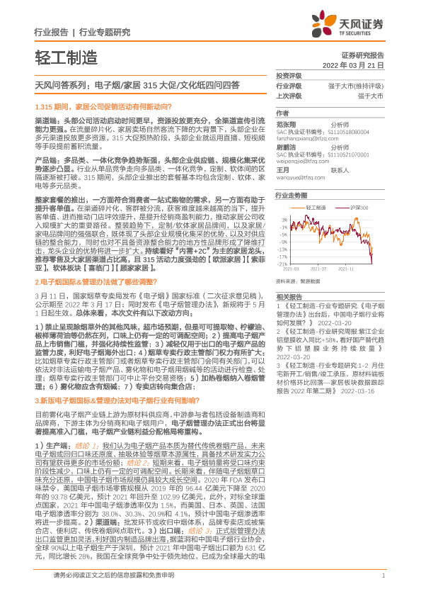 【天风证券】【20220321】天风问答系列:电子烟 家居315大促 文化纸四问四答-13页