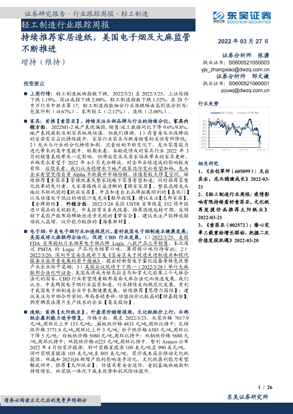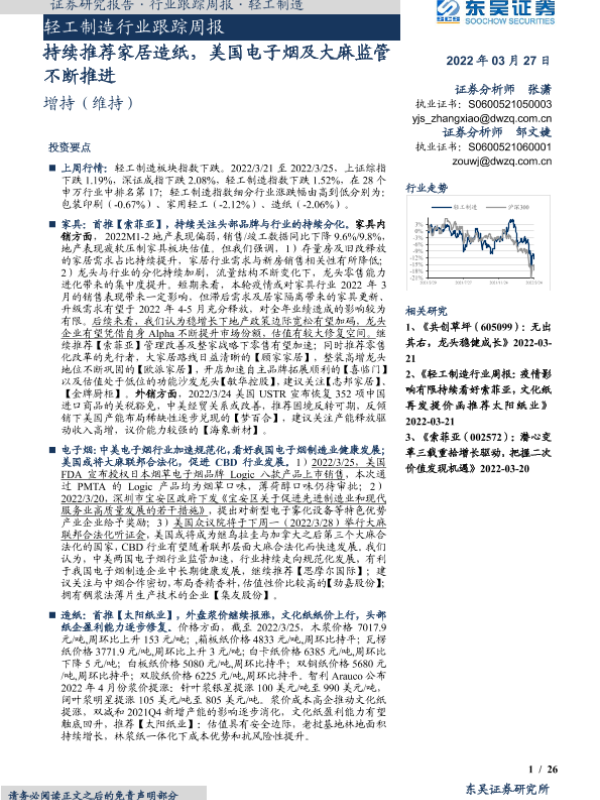 【东吴证券】【20220327】轻工制造行业跟踪周报:持续推荐家居造纸,美国电子烟及大麻监管不断推进-26页