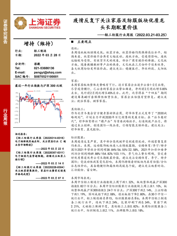 【上海证券】【20220328】20220328-上海证券-轻工纺服行业周报:疫情反复下关注家居及纺服版块优质龙头长期配置价值-20页