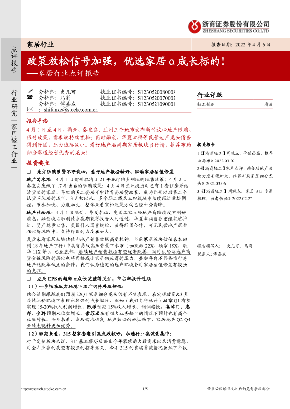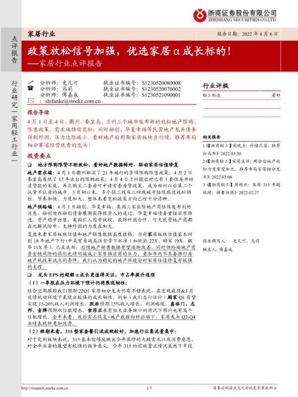 【浙商证券】【20220406】20220406-浙商证券-家居行业点评报告:政策放松信号加强,优选家居α成长标的!-5页