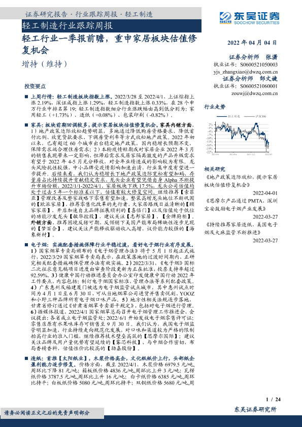 【东吴证券】【20220404】轻工制造行业跟踪周报:轻工行业一季报前瞻,重申家居板块估值修复机会-24页