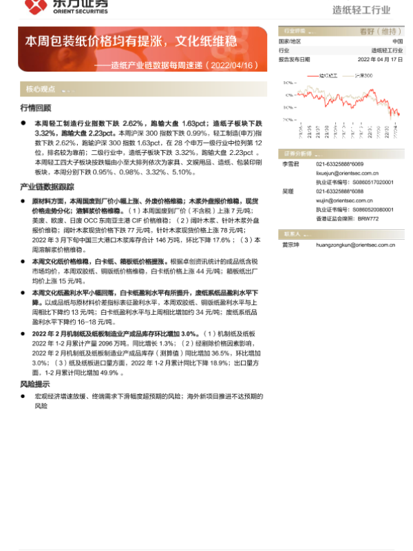 【东方证券】【20220417】20220417-东方证券-造纸产业链数据每周速递:本周包装纸价格均有提涨,文化纸维稳-13页