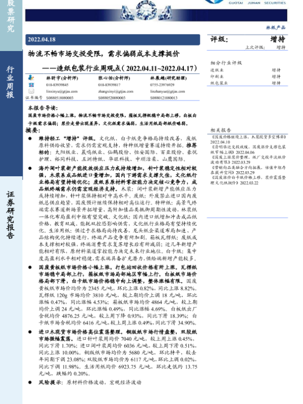 【国泰君安证券】【20220418】20220418-国泰君安-造纸包装行业周观点:物流不畅市场交投受限,需求偏弱成本支撑挺价-4页