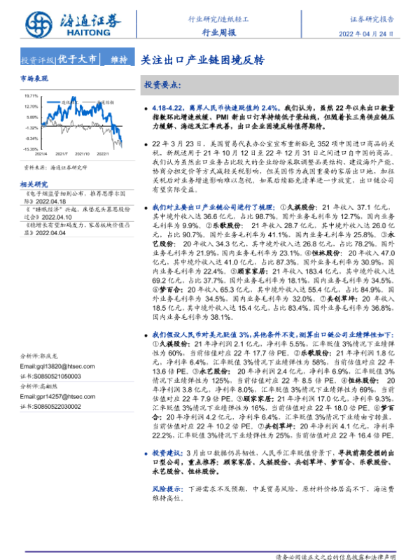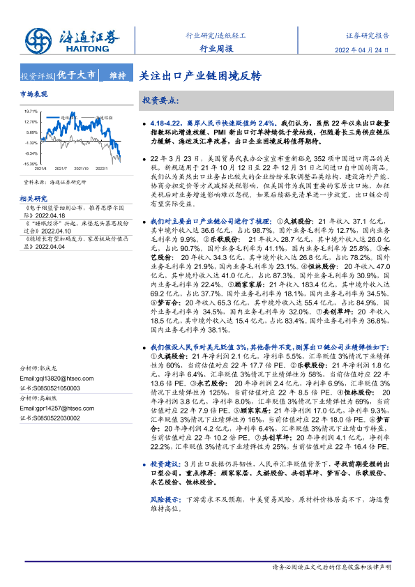 【海通证券】【20220424】20220424-海通证券-造纸轻工行业周报:关注出口产业链困境反转-12页
