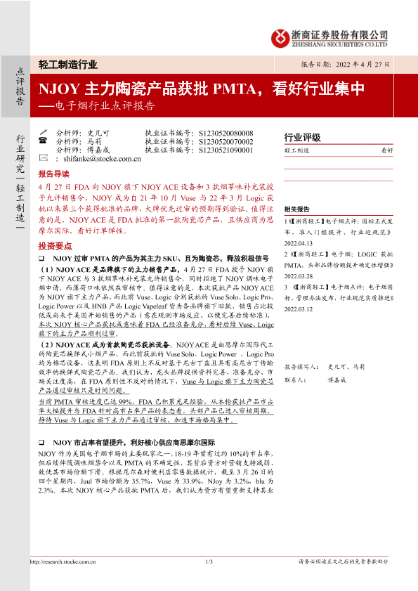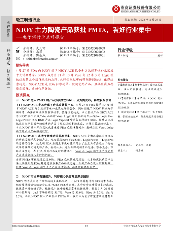 【浙商证券】【20220427】20220427-浙商证券-电子烟行业点评报告:NJOY主力陶瓷产品获批PMTA,看好行业集中-3页