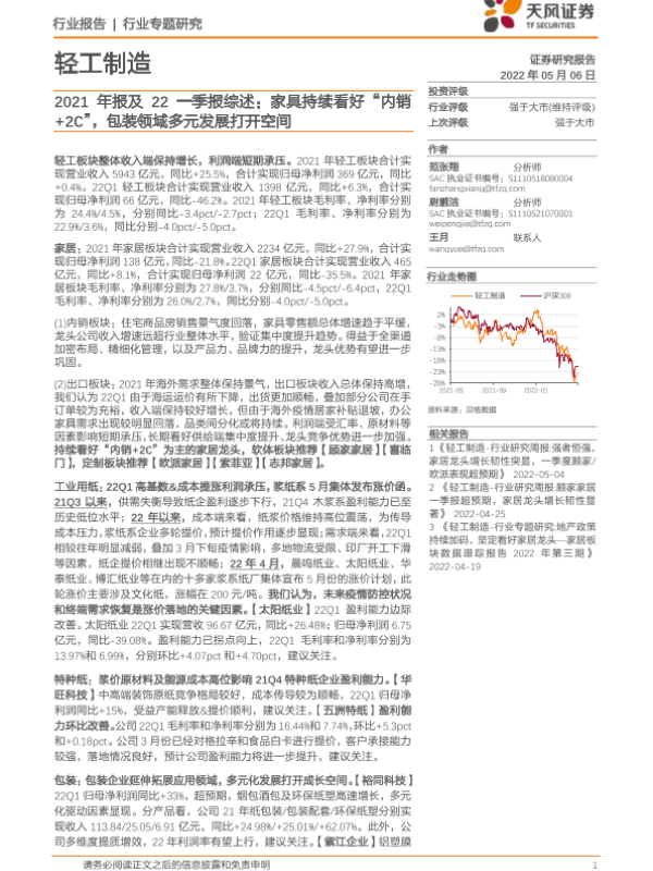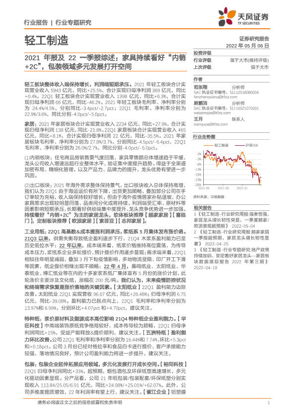 【天风证券】【20220506】轻工制造2021年报及22一季报综述:家具持续看好“内销+2C”,包装领域多元发展打开空间-22页