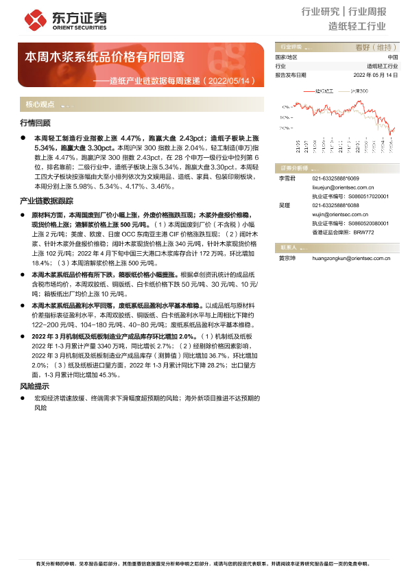 【东方证券】【20220514】20220514-东方证券-造纸产业链数据每周速递:本周木浆系纸品价格有所回落-13页