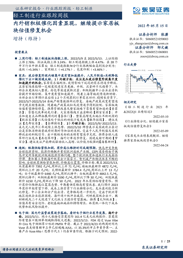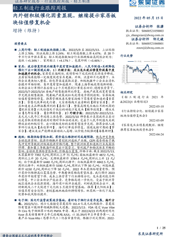 【东吴证券】【20220515】轻工制造行业跟踪周报:内外销积极催化因素显现,继续提示家居板块估值修复机会-25页