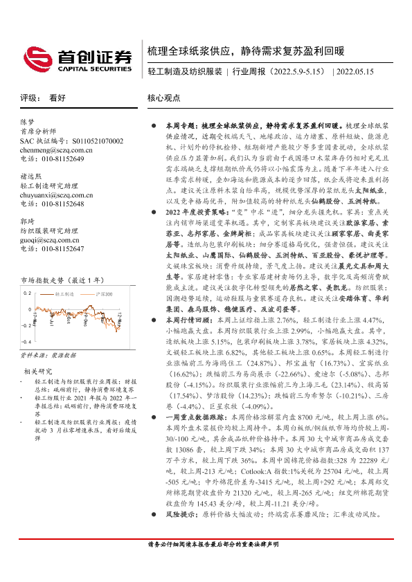 【首创证券】【20220515】20220515-首创证券-轻工制造及纺织服装行业周报:梳理全球纸浆供应,静待需求复苏盈利回暖-19页