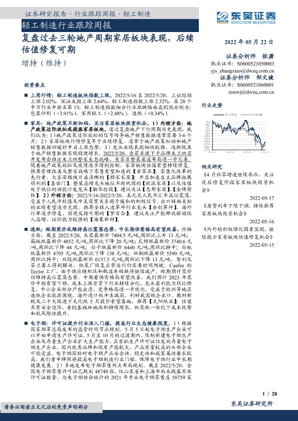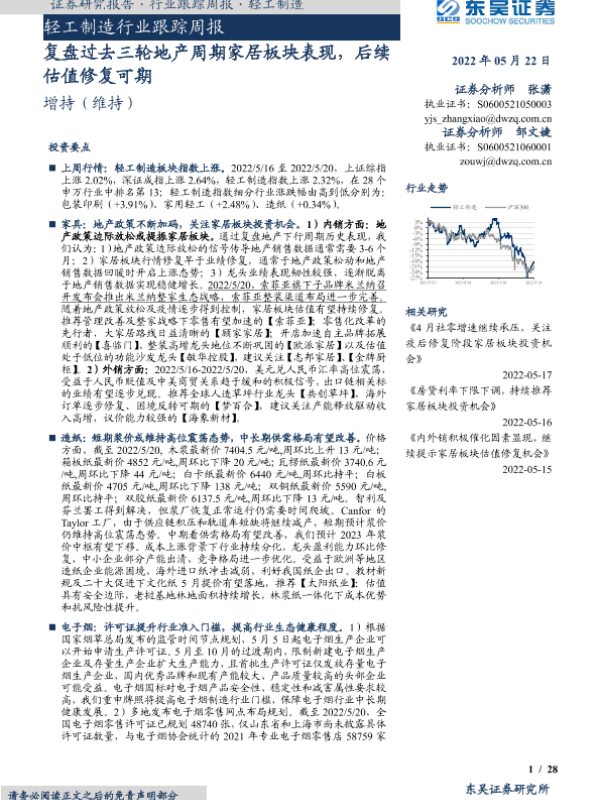 【东吴证券】【20220522】轻工制造行业跟踪周报:复盘过去三轮地产周期家居板块表现,后续估值修复可期-28页