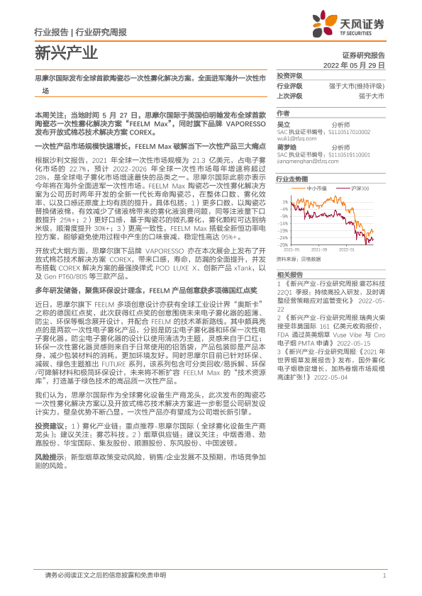 【天风证券】【20220529】新兴产业行业研究周报:思摩尔国际发布全球首款陶瓷芯一次性雾化解决方案,全面进军海外一次性市场-4页