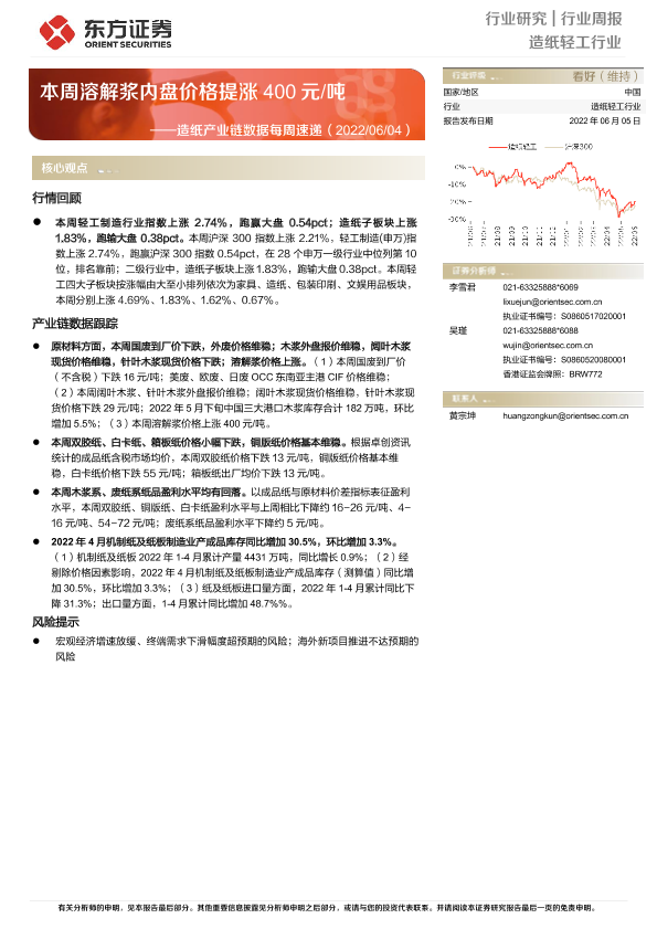 【东方证券】【20220605】20220605-东方证券-造纸产业链数据每周速递:本周溶解浆内盘价格提涨400元 吨-13页