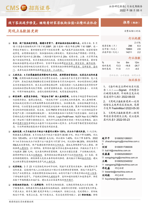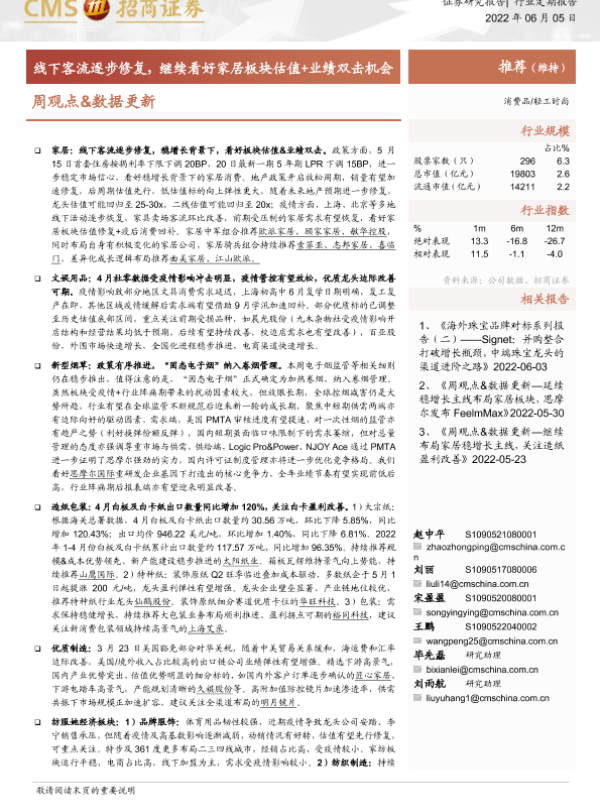 【海通证券】【20220605】轻工时尚周观点&数据更新:线下客流逐步修复,继续看好家居板块估值+业绩双击机会-18页
