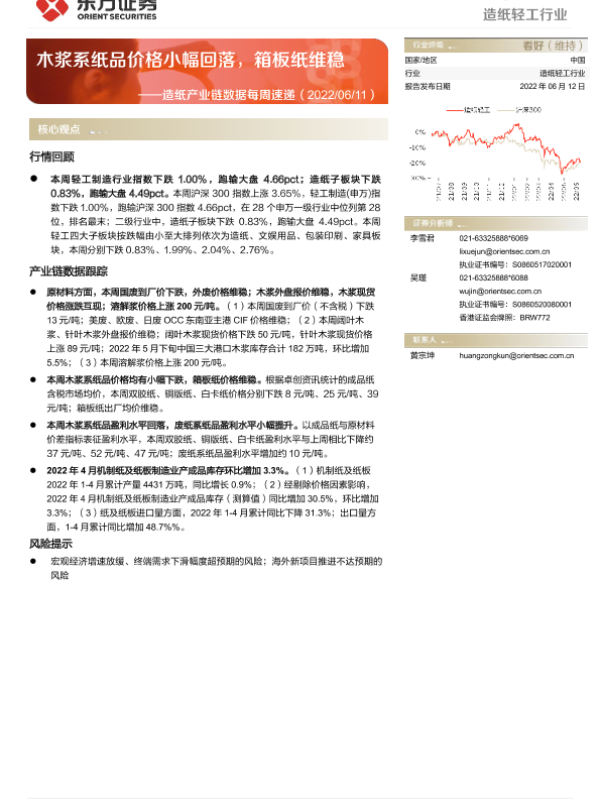 【东方证券】【20220612】20220612-东方证券-造纸产业链数据每周速递:木浆系纸品价格小幅回落,箱板纸维稳-12页