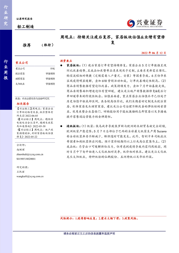 【兴业证券】【20220612】周观点:持续关注疫后复苏,家居板块估值&业绩有望修复-20页