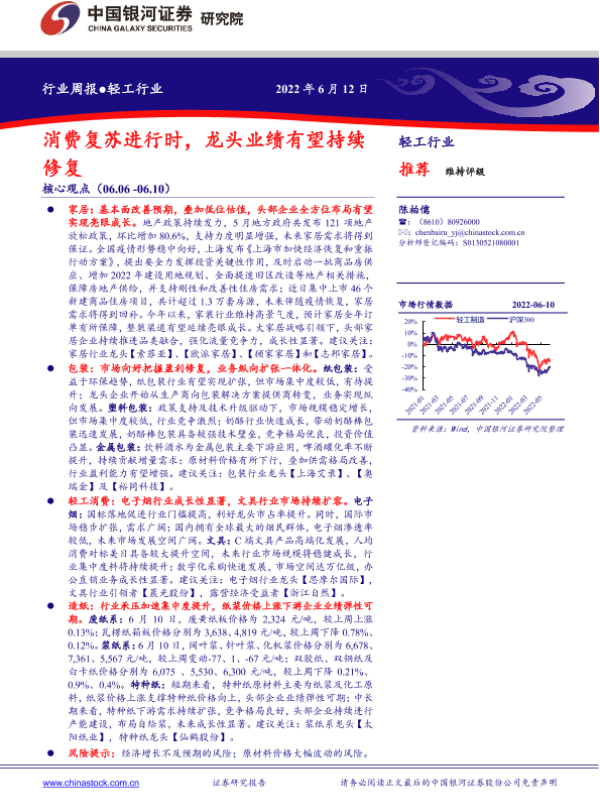【银河证券】【20220612】20220612-中国银河-轻工行业周报:消费复苏进行时,龙头业绩有望持续修复-22页