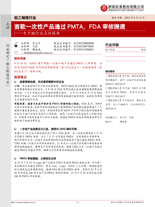 【浙商证券】【20220613】20220613-浙商证券-电子烟行业点评报告:首款一次性产品通过PMTA,FDA审核提速-3页