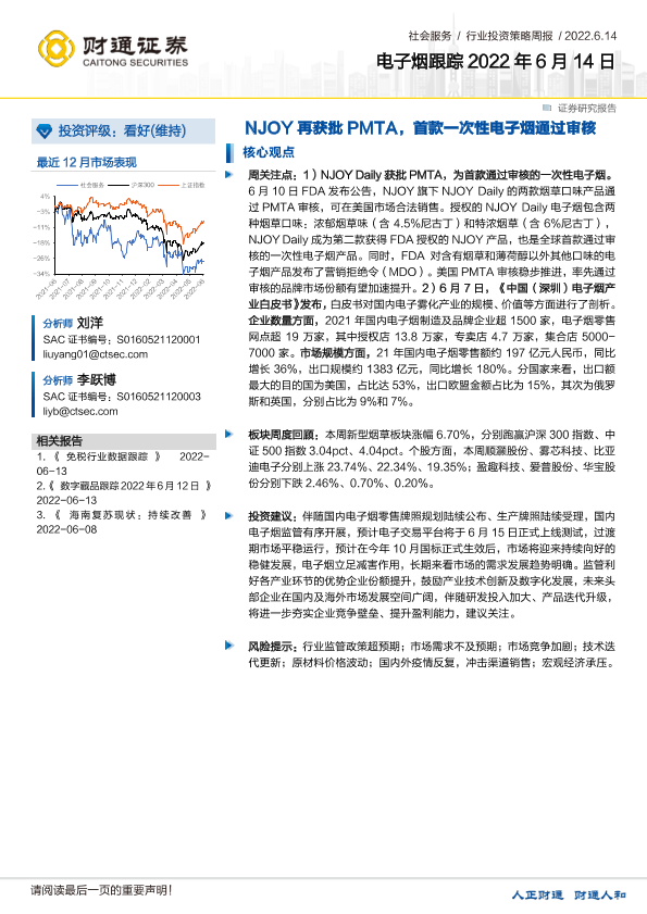 【财通证券】【20220614】社会服务行业投资策略周报:电子烟跟踪-NJOY再获批PMTA,首款一次性电子烟通过审核-8页