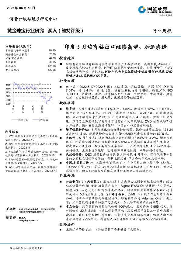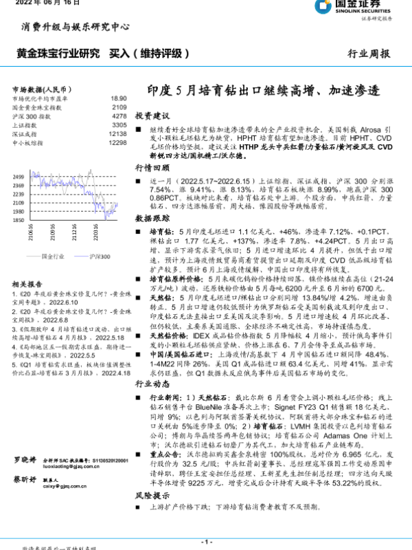 【国金证券】【20220616】20220616-国金证券-黄金珠宝行业周报:印度5月培育钻出口继续高增、加速渗透-15页
