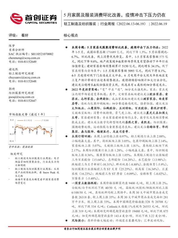 【首创证券】【20220619】20220619-首创证券-轻工制造及纺织服装行业周报:5月家居及服装消费环比改善,疫情冲击下压力仍在-17页
