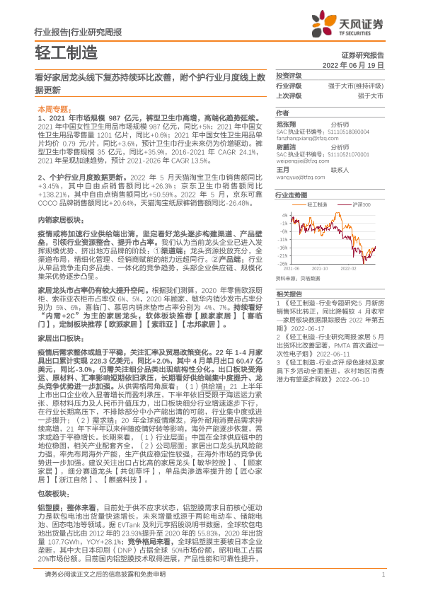 【天风证券】【20220619】20220619-天风证券-轻工制造行业研究周报:看好家居龙头线下复苏持续环比改善,附个护行业月度线上数据更新-27页
