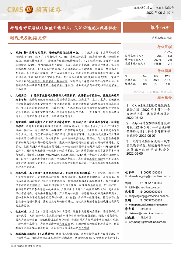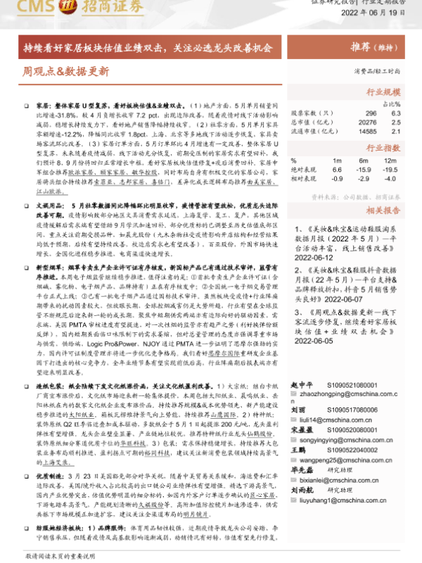 【海通证券】【20220619】轻工时尚周观点&数据更新:持续看好家居板块估值业绩双击,关注必选龙头改善机会-18页